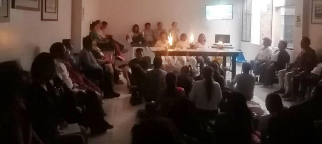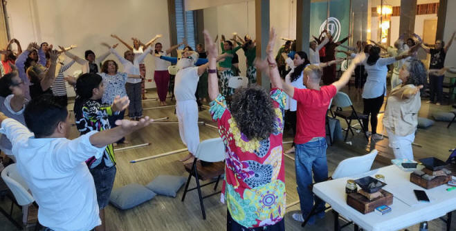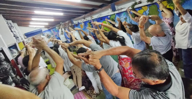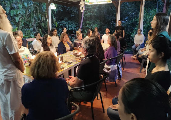 | La tercera y última parte de nuestro viaje de Gracia por Colombia, nos llevó en el eje cafetero, enseñando Agnihotra y presentando algunos de los tantos maravillosos efectos de la práctica de los fuegos sanadores de la Terapia Homa. Estas bendecidas sesiones estaban acompañadas de Ejercicios Terapéuticos de Yoga, que es sinónimo a salud, flexibilidad, alegría, movimiento, ... Fotos de esta y de la próxima página son de un encuentro en la Granja Homa La Herencia de la familia Dora Betancur. | ||