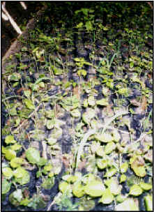 Plantones de Copaiba En camas de repique a punto de ser desechadas por el ataque de un hongo no tipificado. A la que una semana atrás se le aplicó un fungicida de contacto que no hizo efecto a la acción del hongo. Anteriormente se le trataron varias veces con fungicidas sistémicos, no teniendo ningún resultado positivo.