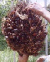 unas palmas había racimos verdes y grandes frutos. La plaga se invirtió, porque había una larva de mariposa que andaba en la hoja, esta salía en la noche, comía y en el día se escondía. Todo se invirtió, en el día salían se caían y las lagartijas se las comían y se acomodaba el ciclo biológico en forma natural. Este proyecto se continúo por tres meses, tuve que salir y cuando regrese vi los frutos de los racimos muy grandes y toda la gente estaba muy feliz. Los obreros trabajan con la Terapia Homa." |
