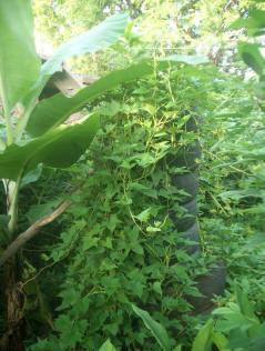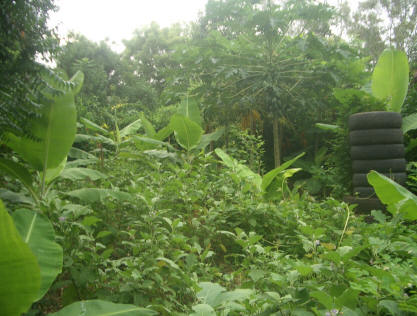huerto. - Foto 2: Camotes creciendo en una pila de neumáticos. - Foto 3: Papaya, banana